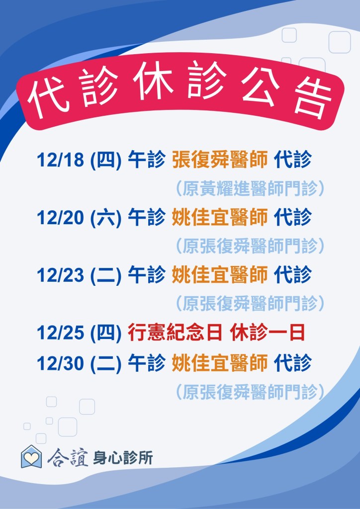 12/23 (二) 午診 姚佳宜醫師 代診(原張復舜醫師門診)